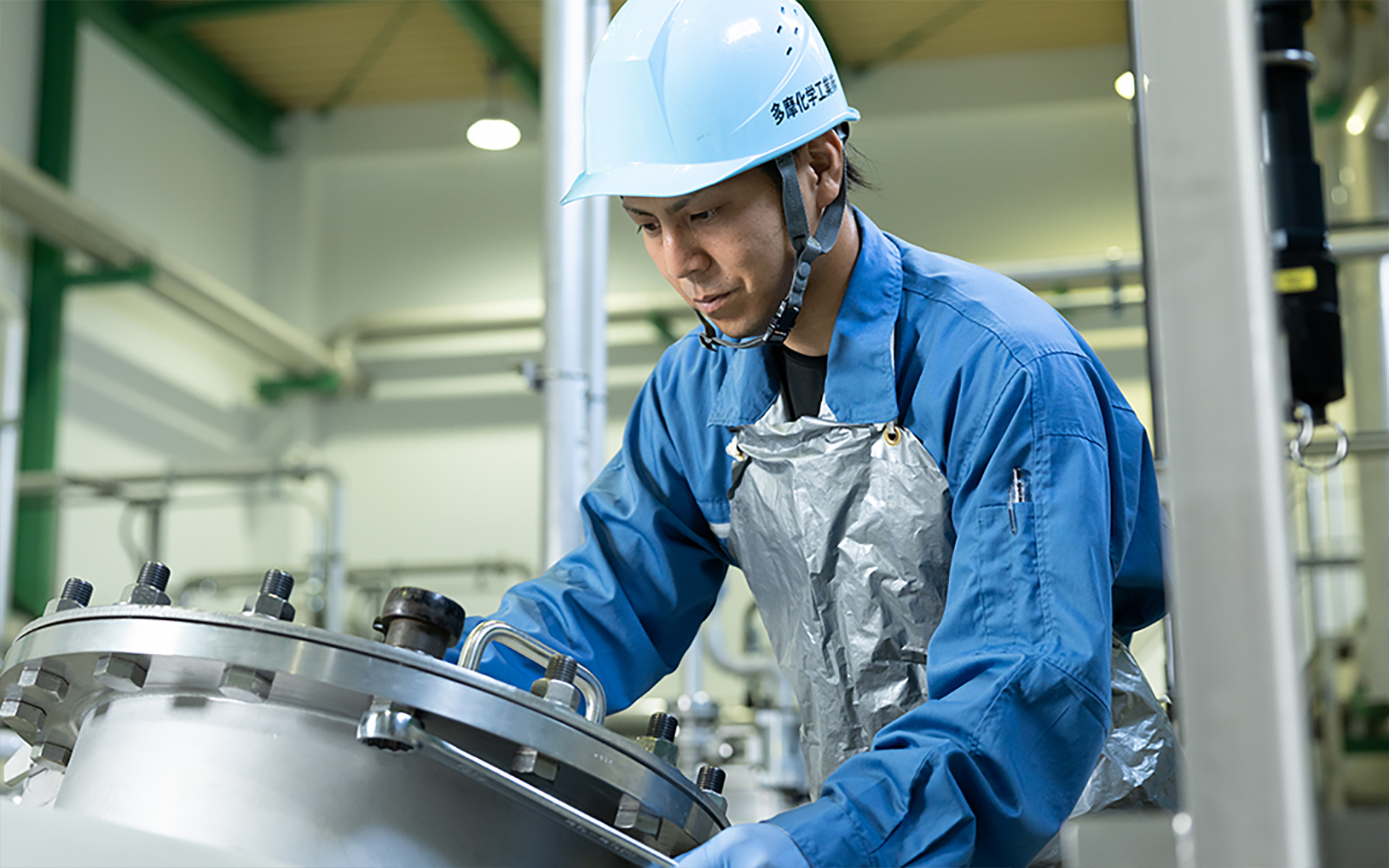 製造部門は、原料の投入から、生産設備の稼働チェック、製品の充填、設備の点検やメンテナンスなど、製品を安定供給するうえで欠かせない幅広い工程を担当しています。