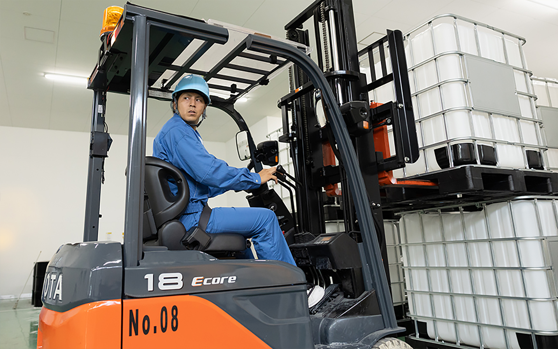 完成した製品を、フォークリフトで充填ルームに運んで専用の容器に充填していきます。製品が問題なく出荷できるようにする最終工程です。