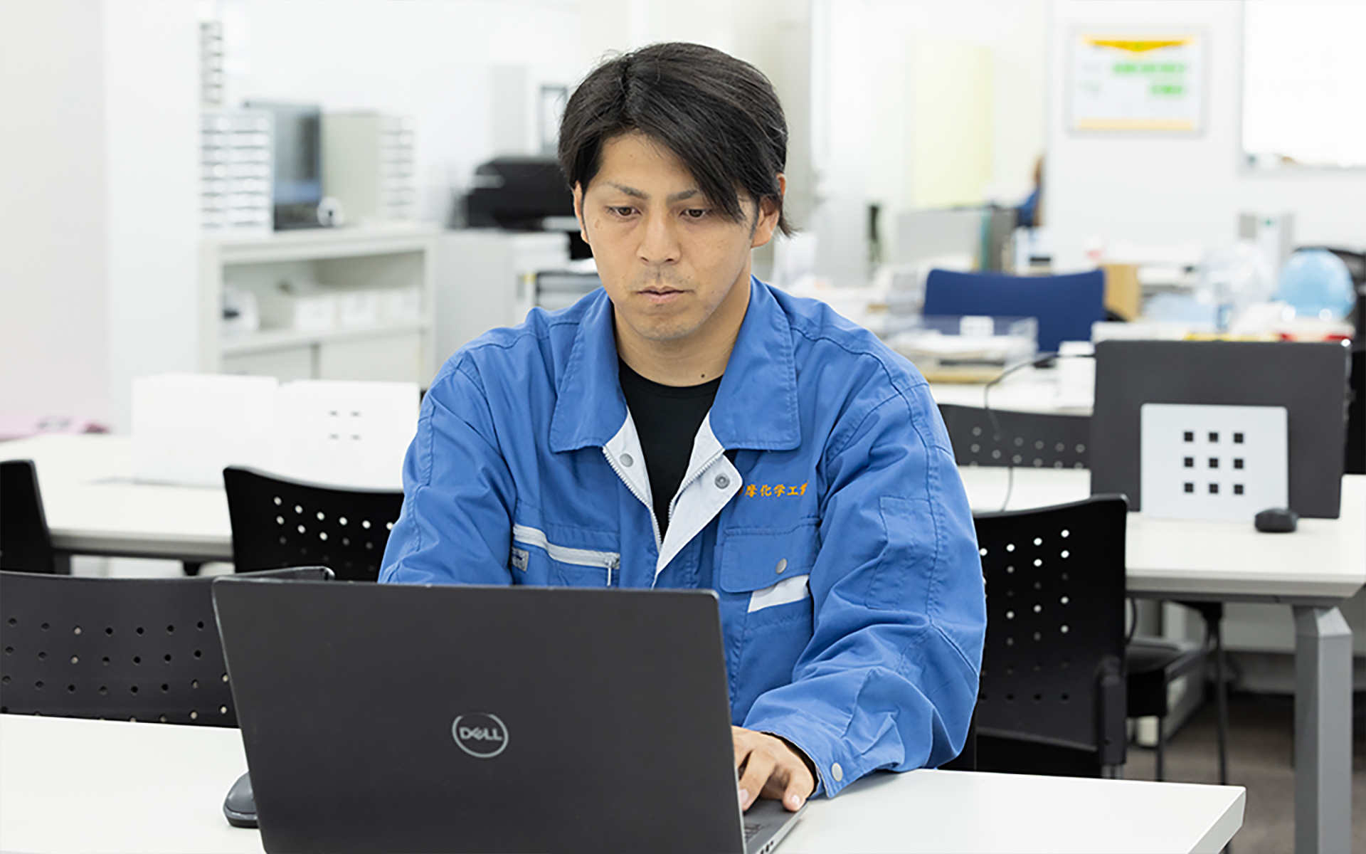 各種データをシステムに入力し、使用した原料や製品の在庫数などを確認します。グループ長補佐を任されている現在は、月間生産計画の作成も業務のひとつです。目の前の作業だけでなく、先を見据えて取り組むことが大事になります。